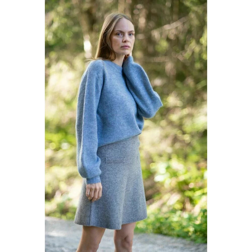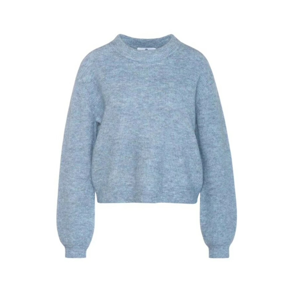 Navn: Arnie Says Sally Sweater Farge: Blå/ Blue malange Beskrivelse: Sally fra Arnie Says er en super genser med ribbete detaljer og rund hals. Matariale: 35% ull, 15% kid mohair, 47% nylon, 3% spandex.