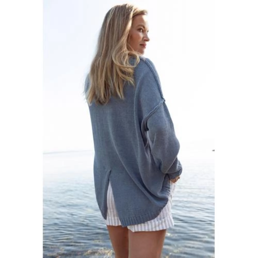 Løs og ledig strikk med lomme foran. Bomull, Lin og nylon. Kjølig strikk