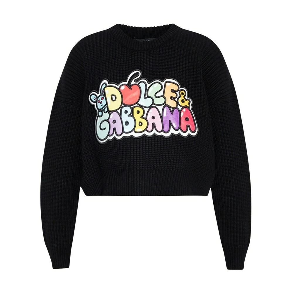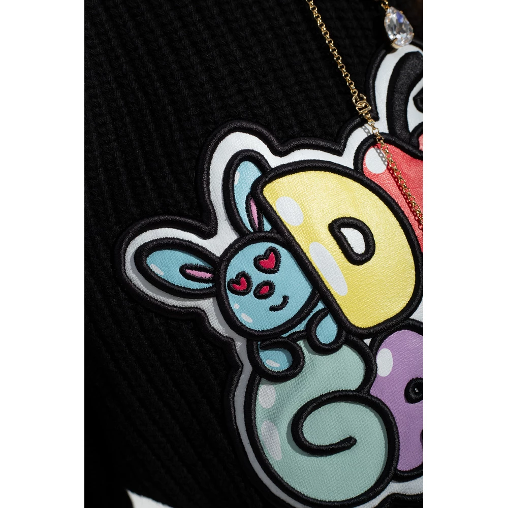 Svart crewneck -genser fra Dolce Gabbana. Denne stilen er laget av ull med en overdimensjonert passform, og har fargerik broderi -logo -lapp av den italienske tegneseriedesigneren Gianpiero D Alessandro på fronten og ribbede trimmer på kragen, bunnhemmen og mansjettene.