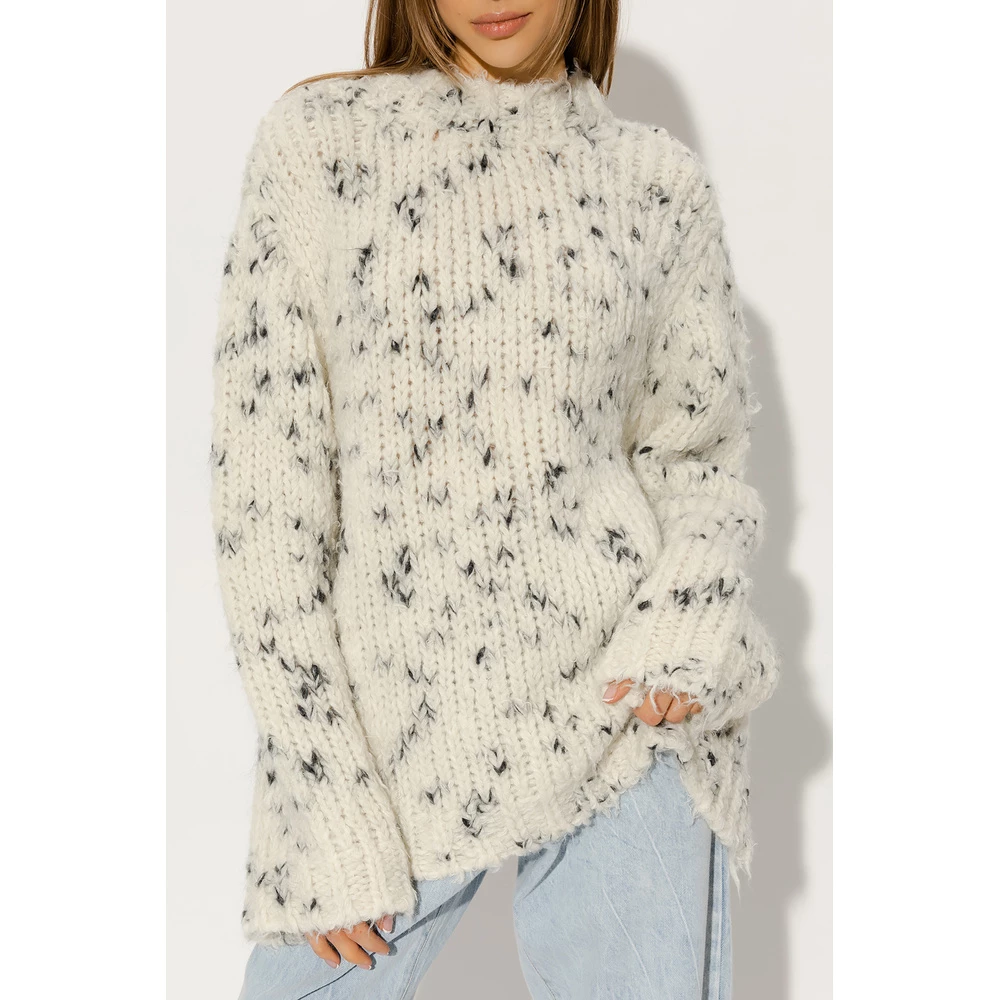 Krem og svart genser fra Dries Van Noten. Denne stilen er laget med en ribbet strikk, og har en avslappet passform, en stående krage og lange ermer.