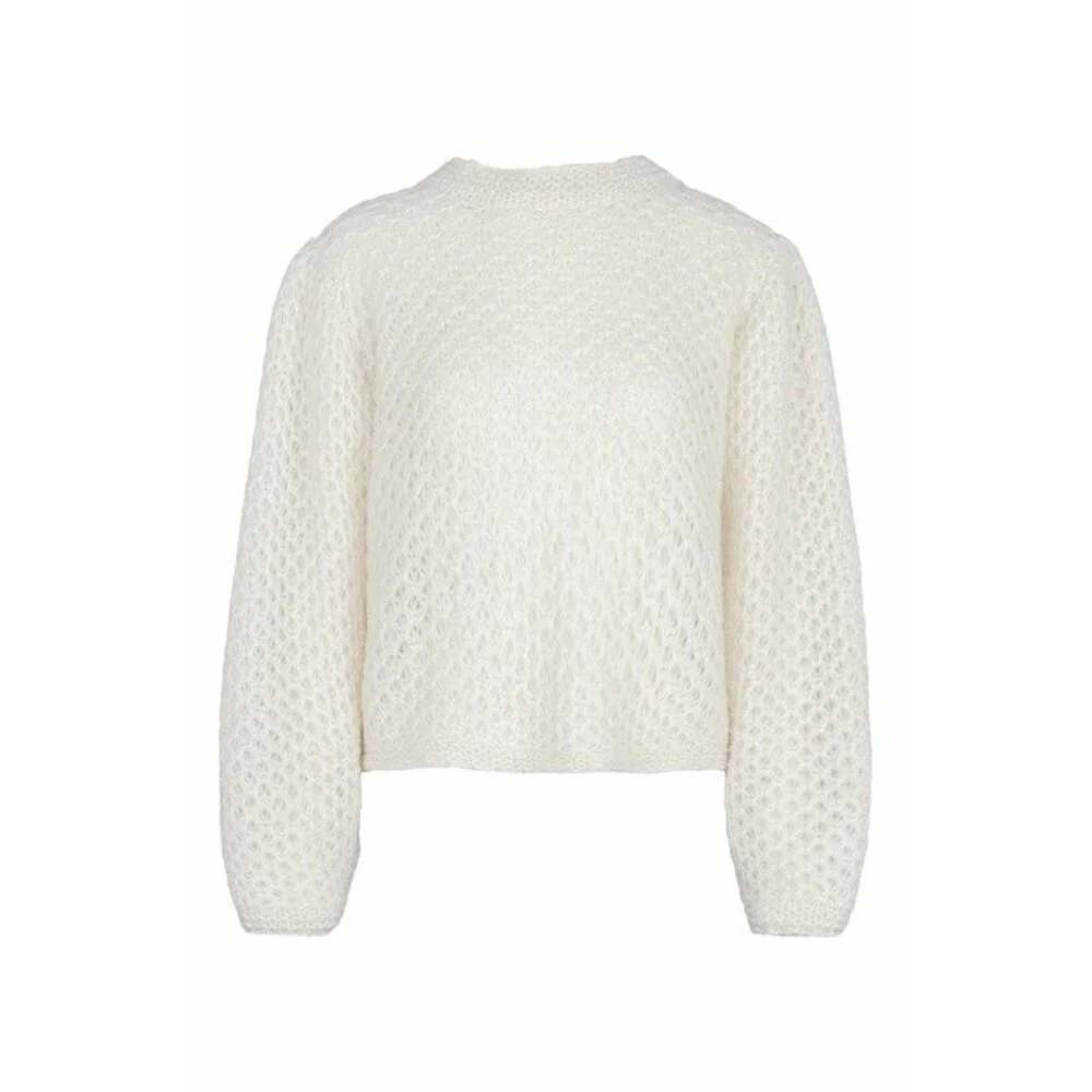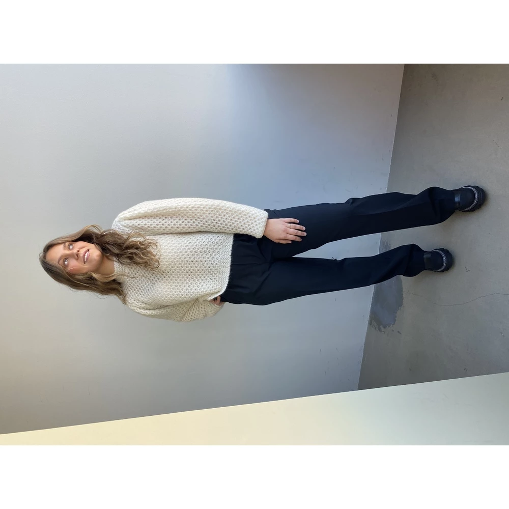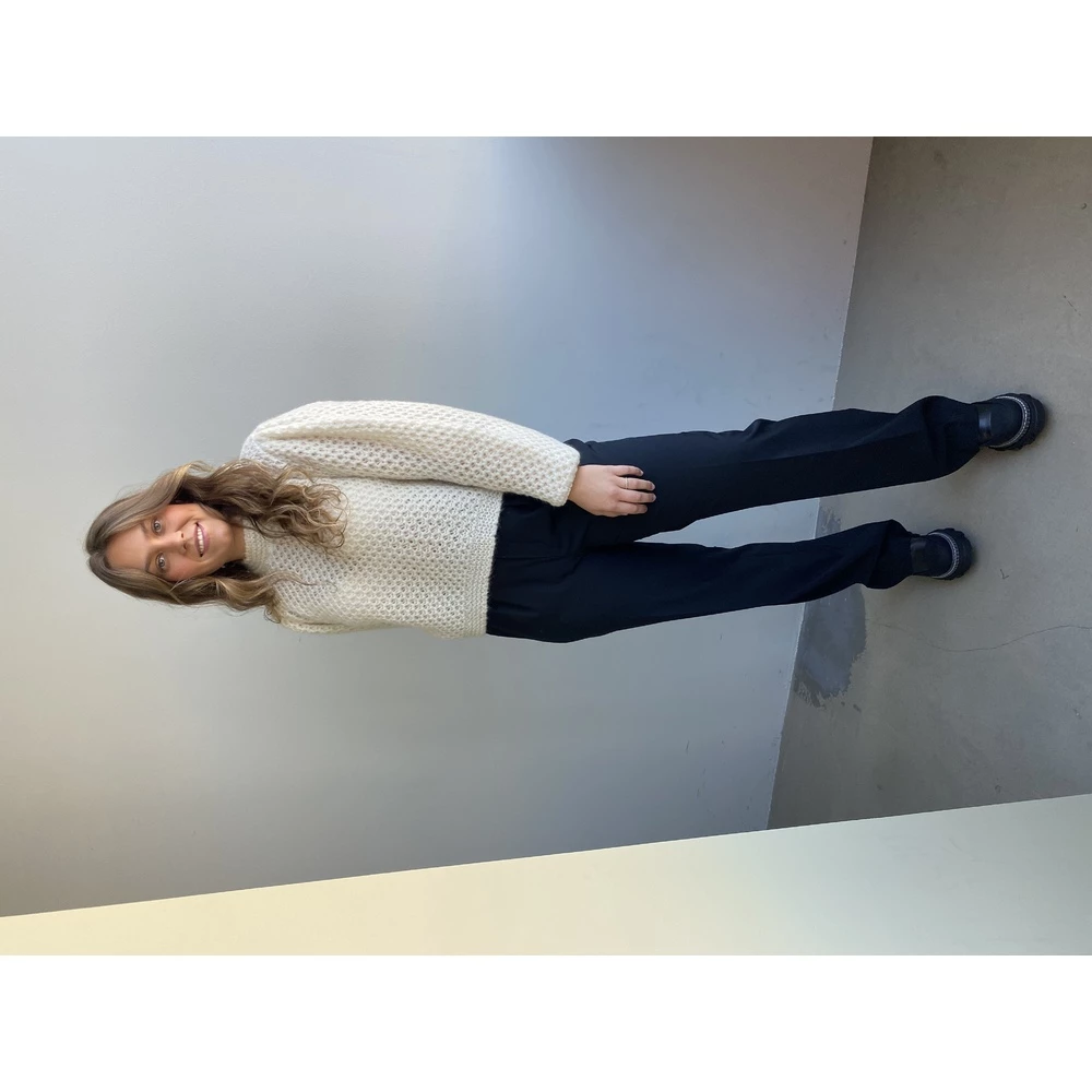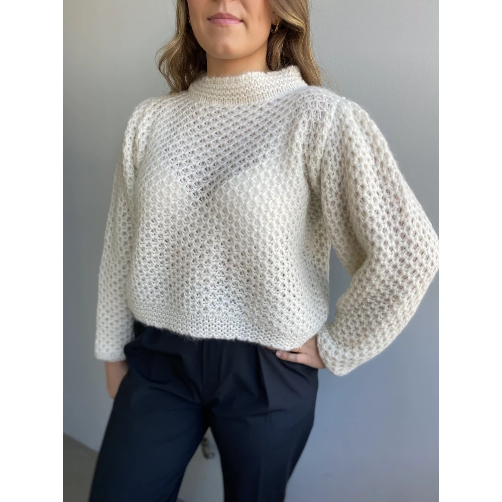Sue Knit fra Norske Envelope1976. Nydelig chunky strikk i en delikat krem farge og deilig mohair blanding. Genseren har høy hals og ballongermer. Modellen har en løs passform og noe croppet i lengden. Materiale: 35% superkid mohair 35% baby alpaca 30% recycled polyamide