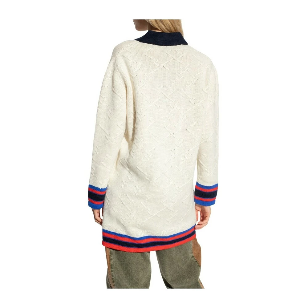Krem løsmontering fra Etro. Denne V-hals-designen er laget av en ull- og kashmirblanding, og har dekorativ snøring, jacquard-logo-mønster og ribbestrikkede trimmer i marinen, rød og blå ved hem og mansjetter.
