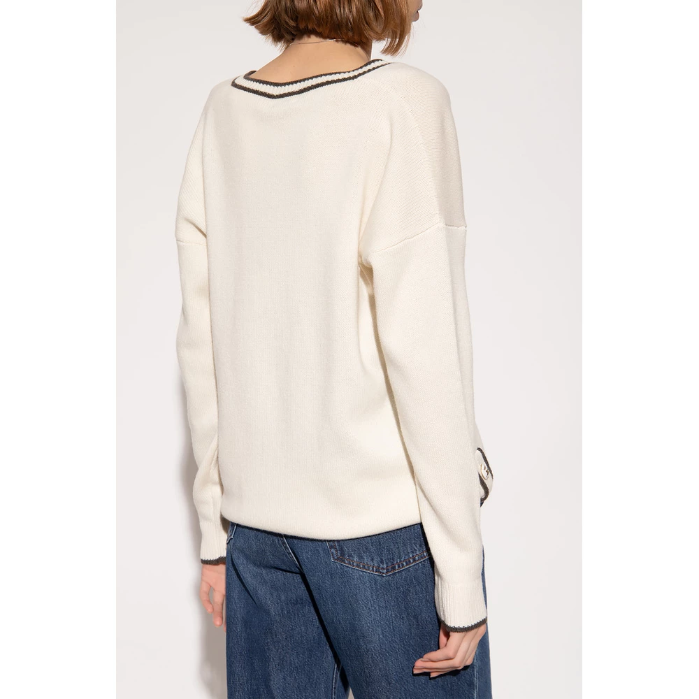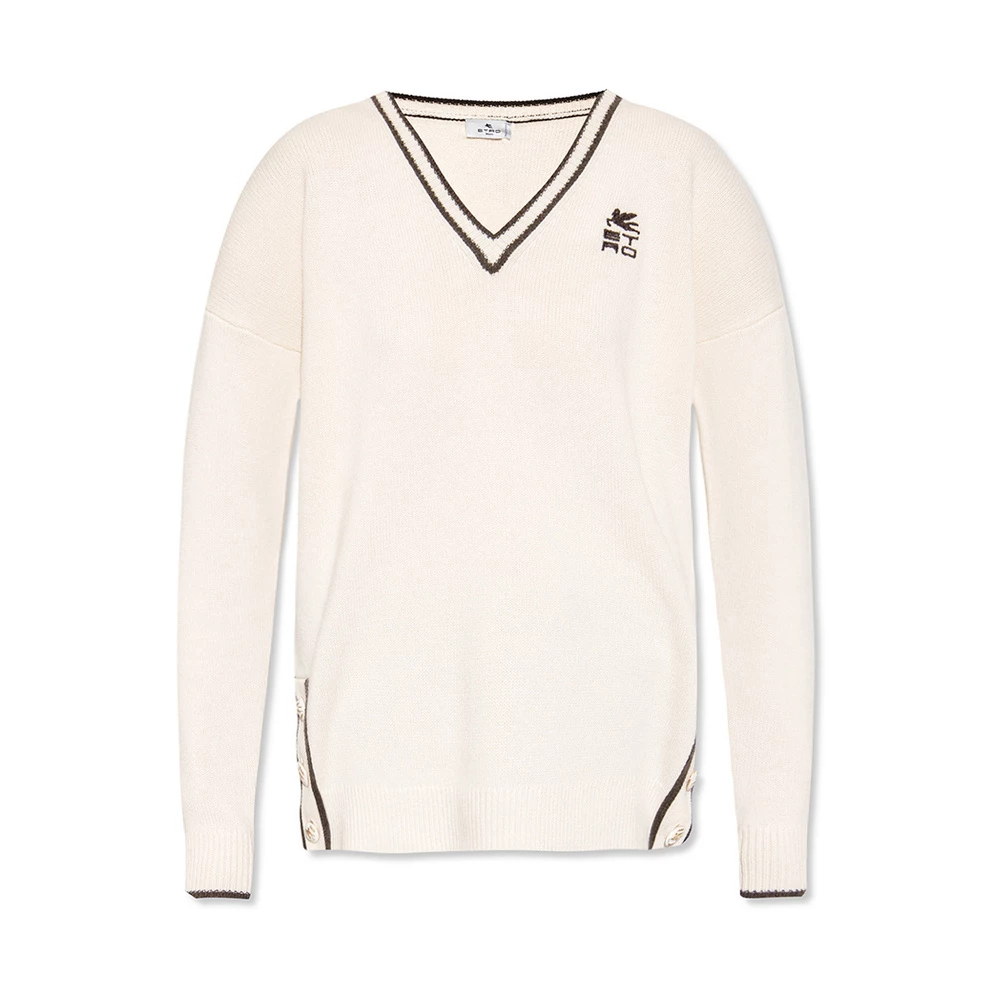 Krem og brun genser fra Etro. Denne designen er laget av en kashmirblanding, og inneholder en ‘Etro Cube’ logo-broderi, dekorative Pegaso-knapper på sidene og ribbestrikket trimmer ved V-halsen, hem og mansjetter.