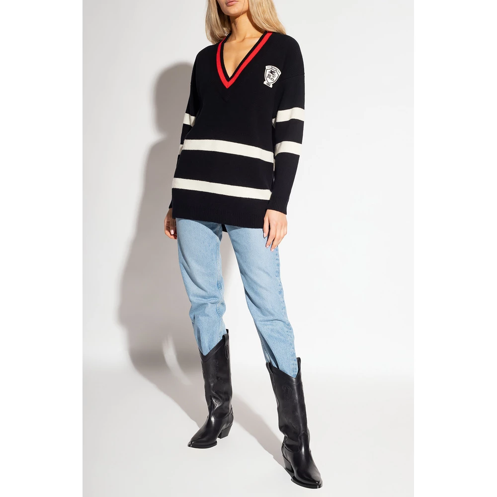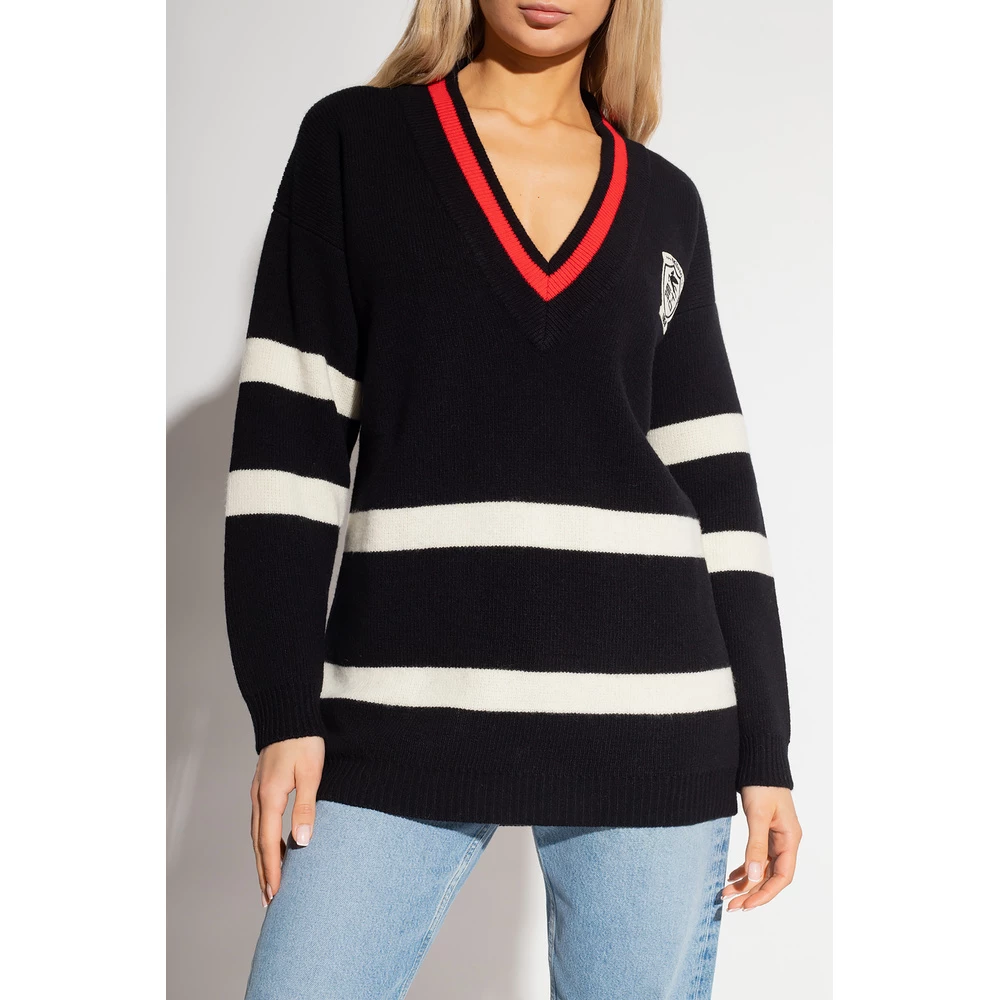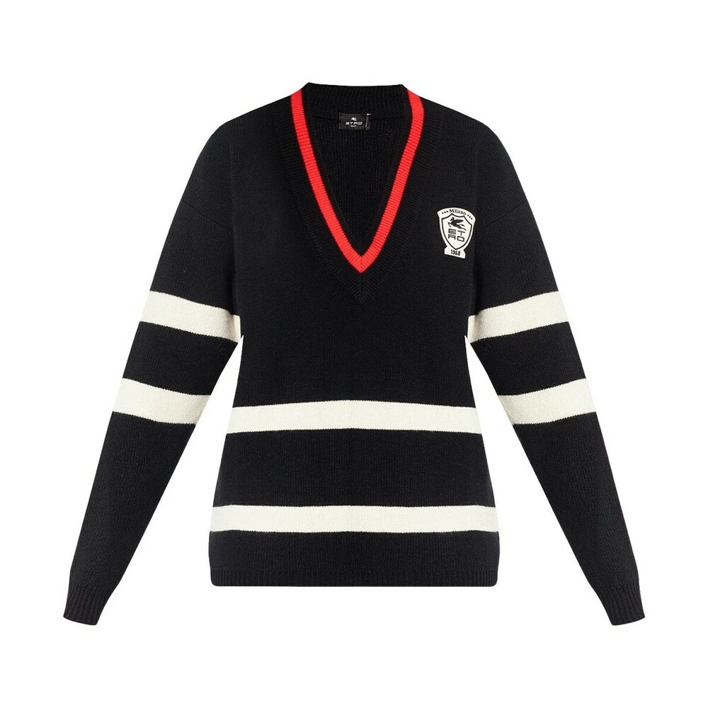 Svart, rød og hvit V-hals-genser fra Etro. Denne stilen er laget av ull, og har en hvit og svart logo -lapp og ribbeina på kantene.
