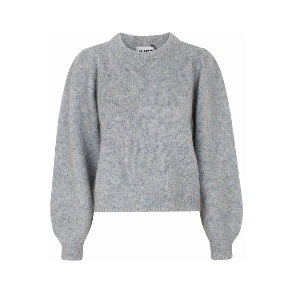 Kjempefin kort strikkegenser i blå/grå. Vid og løs fasong med vide ermer. 3