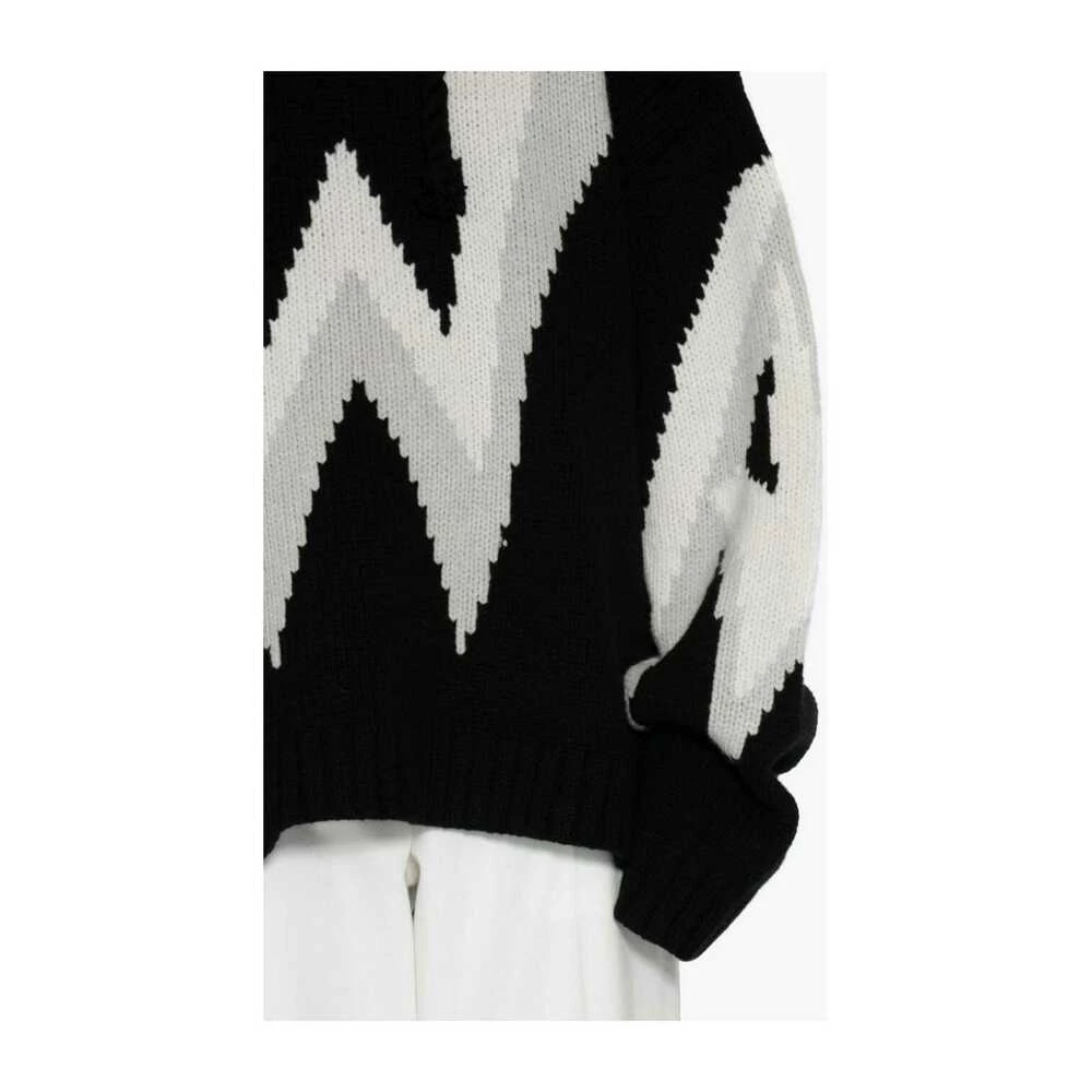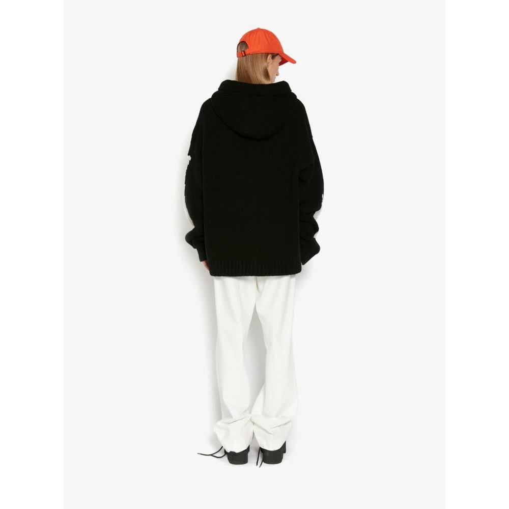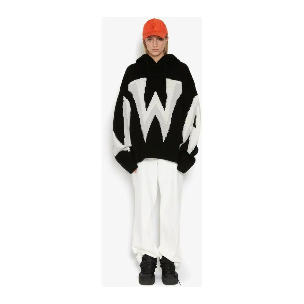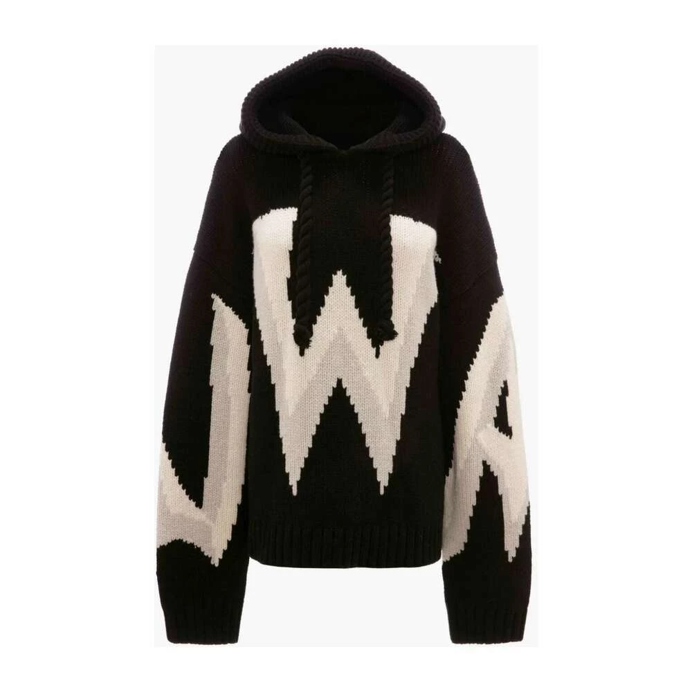 JW Anderson Sweaters Black Gothic Logo Intarsia Hoodie fra JW Anderson med svart/hvitt, ull, intarsia-strikket logo, ribbet mansjetter, trekkhette, lange ermer og rett hem.