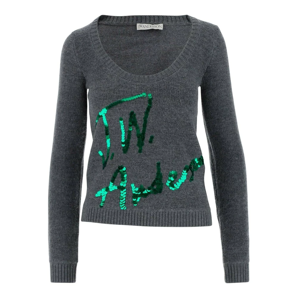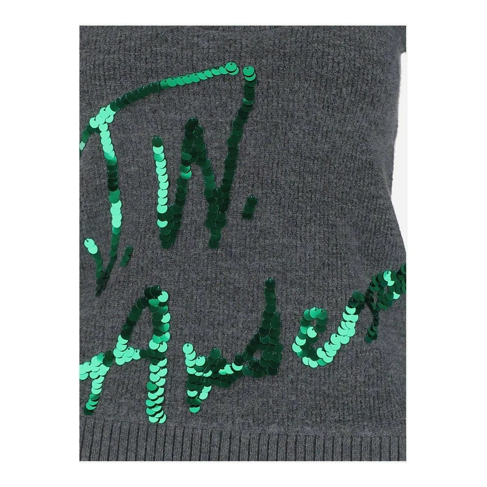 Pullover laget av merino ull rund halsbrodert logo på fronten pyntet med paljetter lange ermer ribbet kanter grå, grønn laget i Kina -komposisjon: 100% merino ull pullover laget av merino ull rund halsbrodert logo foran pyntet med paljetter lange ermer ribbede kanter Grå, grønn laget i Kina -komposisjon: 100% merinoull