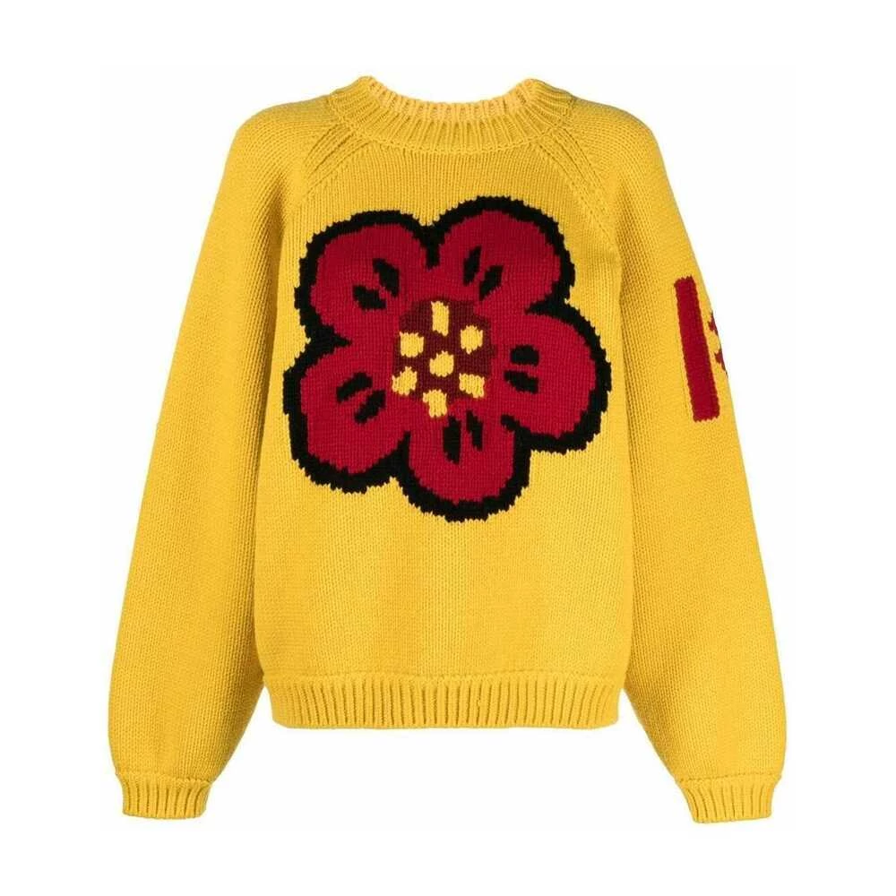Gul genser fra Kenzo. Denne designen er laget av ull, og har et flerfarget brodert blomstermotiv, ‘70’ broderi i rødt og ribbet trims i mannskapshalsen, hem og mansjetter.