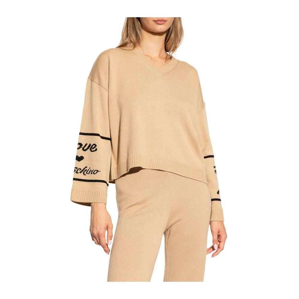 Beige genser fra Love Moschino. Denne stilen er laget med en avslappet silhuett, og har en V-pengelinje, lange ermer og en brodert svart logo.