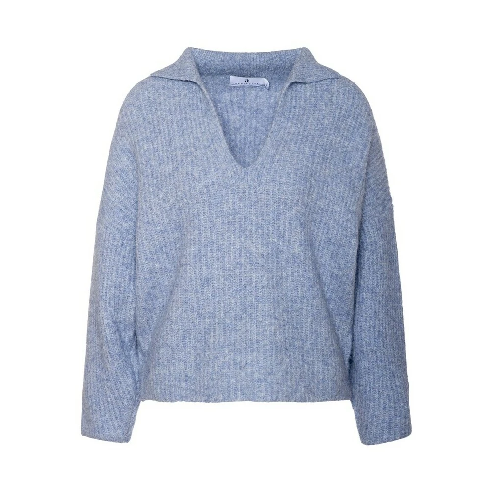 V-halset strikkegenser i en lekker blåmelert farge. Genseren har krage og er romslig i passformen. 42% Ull 16% Mohai 42% 40% Nylon 2% Spandex