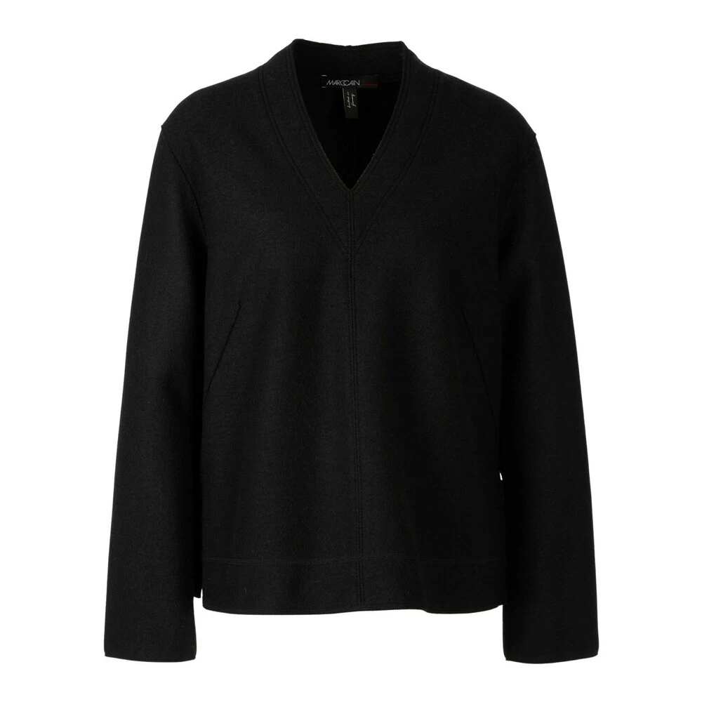 Sweatshirt i en avslappet modell med V-hals og store ermer. Denne modellen er Strikket i Tyskland . Strikking av garnet på staten -av -art -strikkemaskiner og den videre behandlingen av stoffet blir utført på vårt sted i Tyskland. De enkelte delene som ermer, foran osv. Er satt sammen i europeiske partnerbedrifter.
