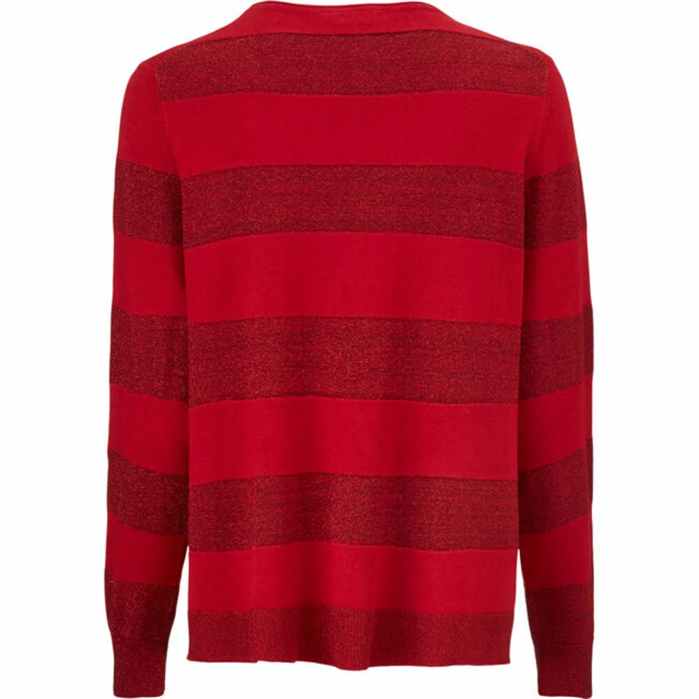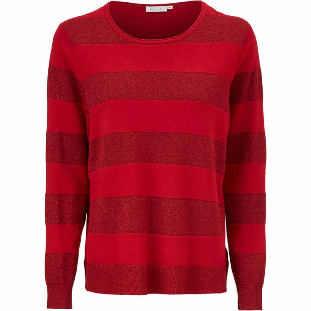 Filina er en genser fra Masai i rødt m/striper av glitter. Rett passform. Laget av 74% viskoe, 14% polyamid, 10% lurex og 2% elastan.