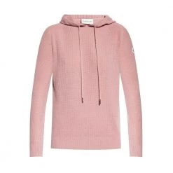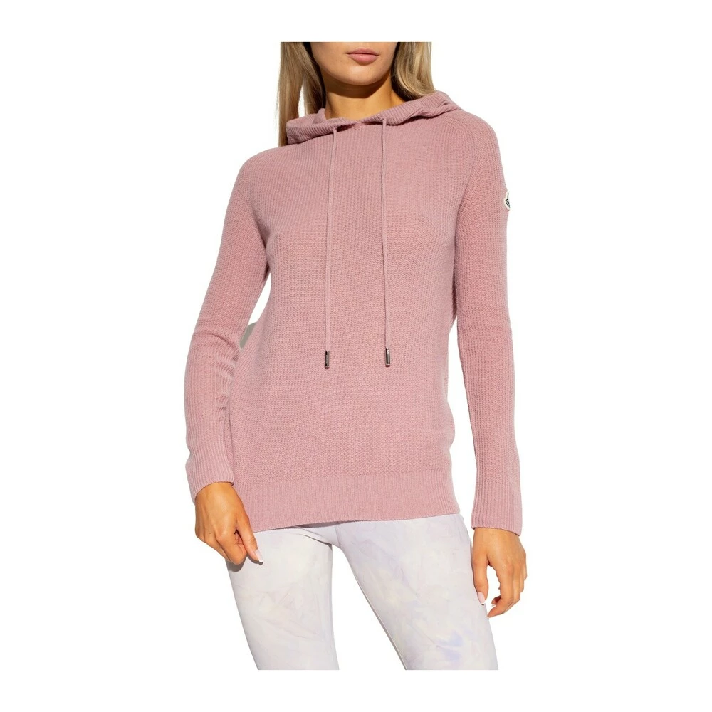 Blush Pink Sweater med en DrawCord-justerbar hette fra Moncler. Denne stilen er laget av en ull- og kashmirblanding, og har lange ermer – man har en fargerik logo -lapp.
