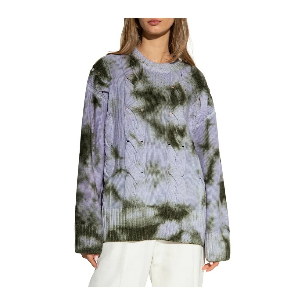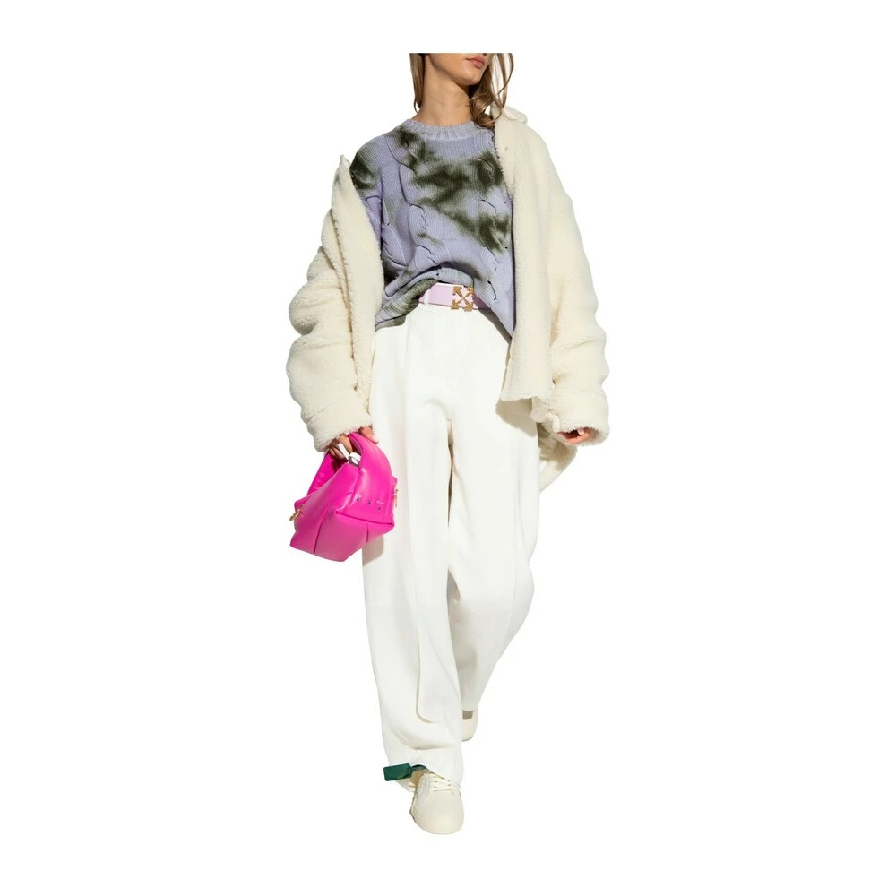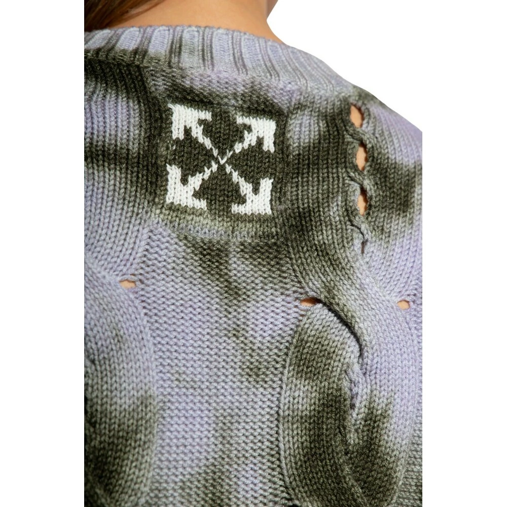 Lilla og mørkegrønn crewneck-genser fra off-white. Denne stilen er laget av ull med en ribbet strikket, og har en avslappet passform, en tie-dyeeffekt, lange ermer, sidespals og merkets signaturpilmotiv bak.