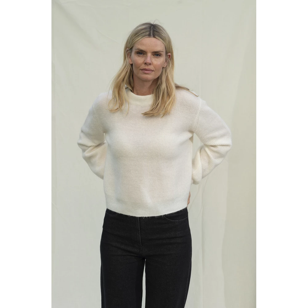 Sally fra Arnie Says er en genser med ribbete detaljer og rund hals. Inneholder: 35% ull, 15% kid mohair, 47% nylon, 3% spandex. Farge: Off-white / Hvit