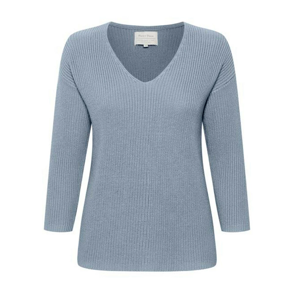 Enkel pullover fra del to. Pulloveren har 3/4 ermer og en V-hals. · Fit: Normal. · Modell: Petronaspw Pullover 30304428 Dusty Blue · Kvalitet: 100% organisk bomull