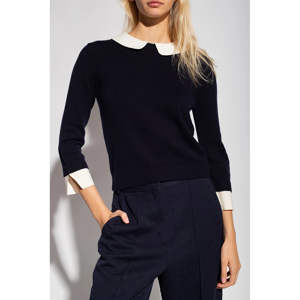 Navyblå genser med en krage fra se av Chloé. Denne stilen er laget av en ull- og bomullsblanding, og har en lukking av ryggknappen, en hvit krage og delte mansjetter, tre-kvart ermer og elastiserte trimmer på kantene.