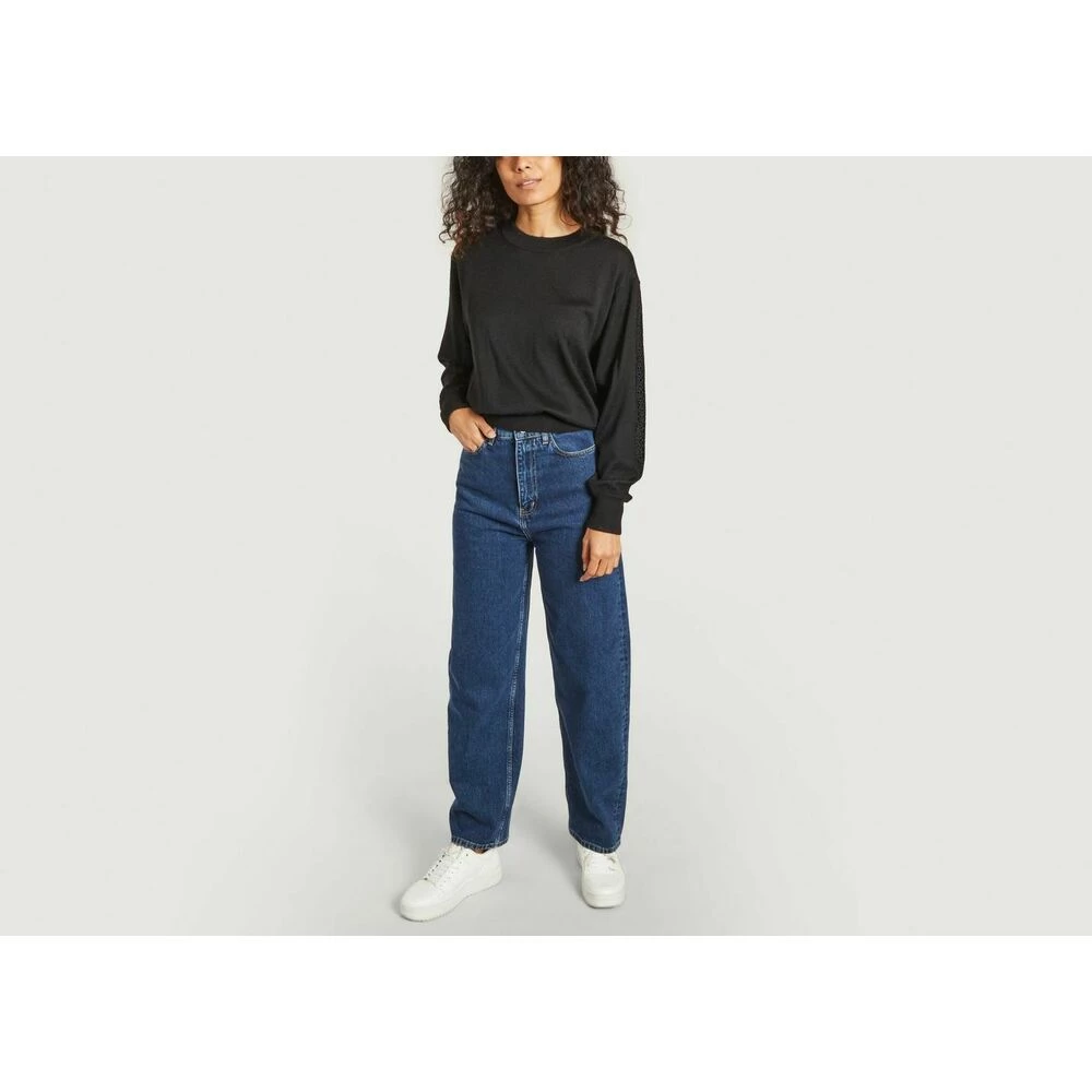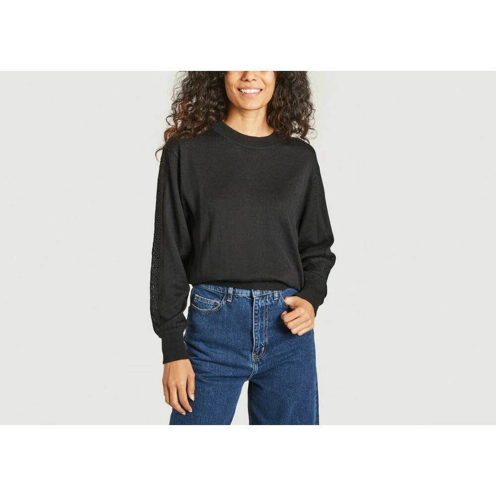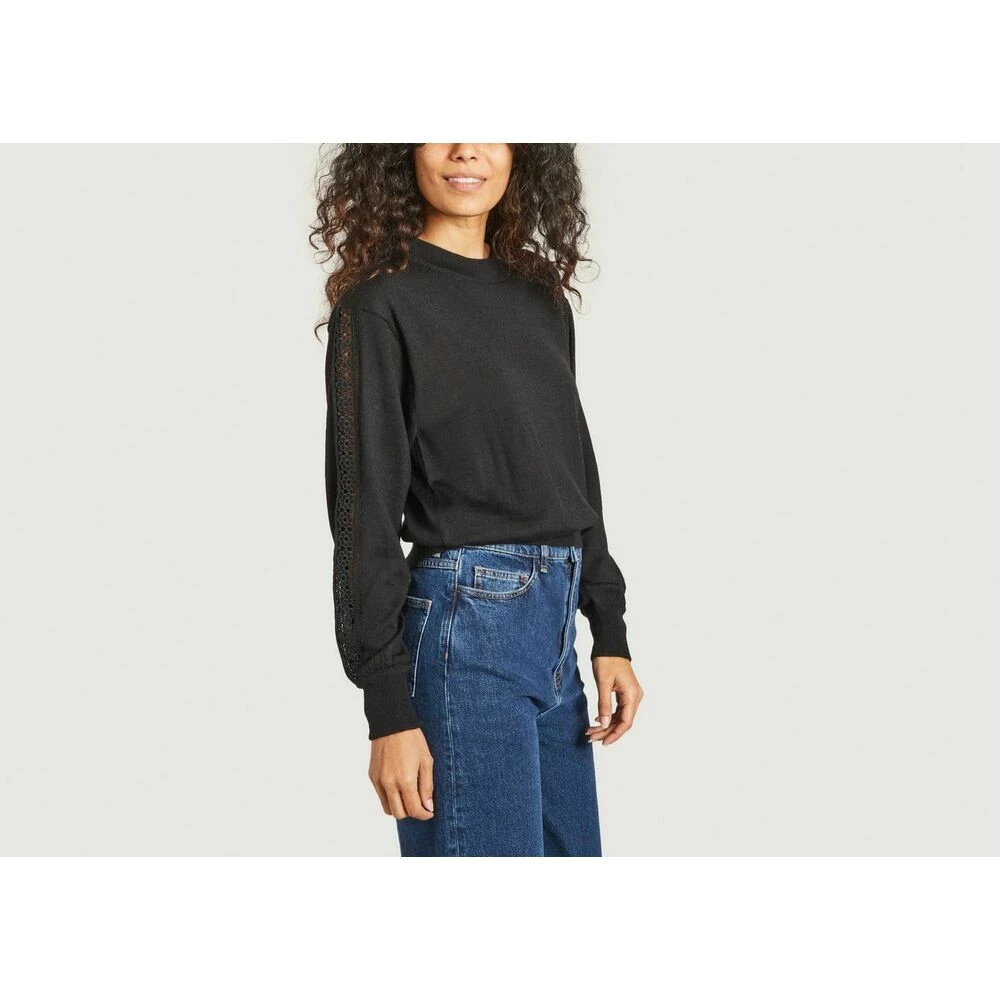 Genser laget av svart ull, akryl og polyester for broderiet i form av blomster på sidene av begge ermene. Den har en løs passform med ribbestrikk på halsen, mansjettene og bunnen av stykket. Gå for denne vanlige toppen som følger med alt! Bruk den tilfeldig med denim -jeans eller med et corduroy -skjørt i dødt bladbrun.