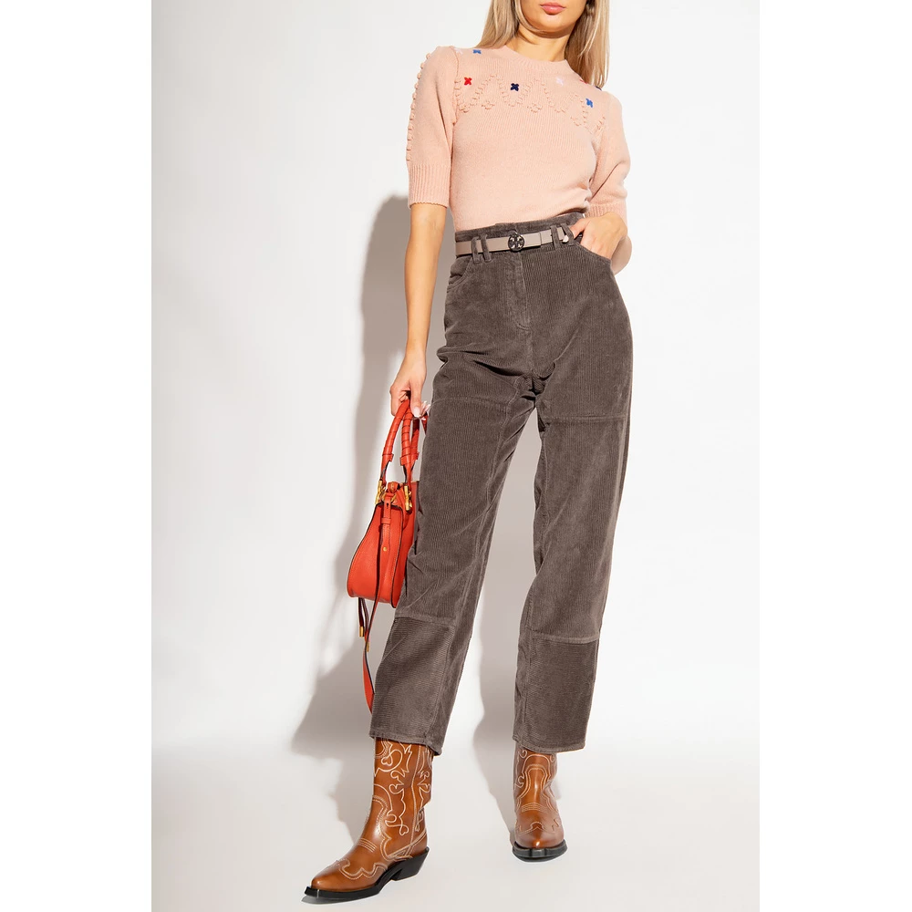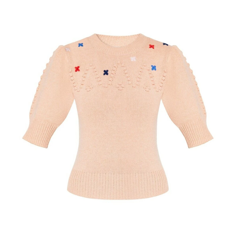 Pink CrewNeck -genser fra See av Chloé. Denne stilen er laget av en bomulls- og merinoullblanding med en særegen strikket, og har en fargerik blomsterbroderi, korte ermer og ribbet trimmer på kantene.