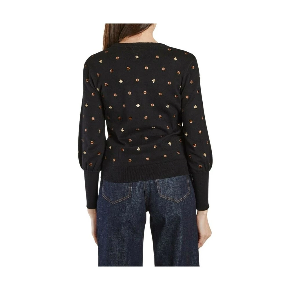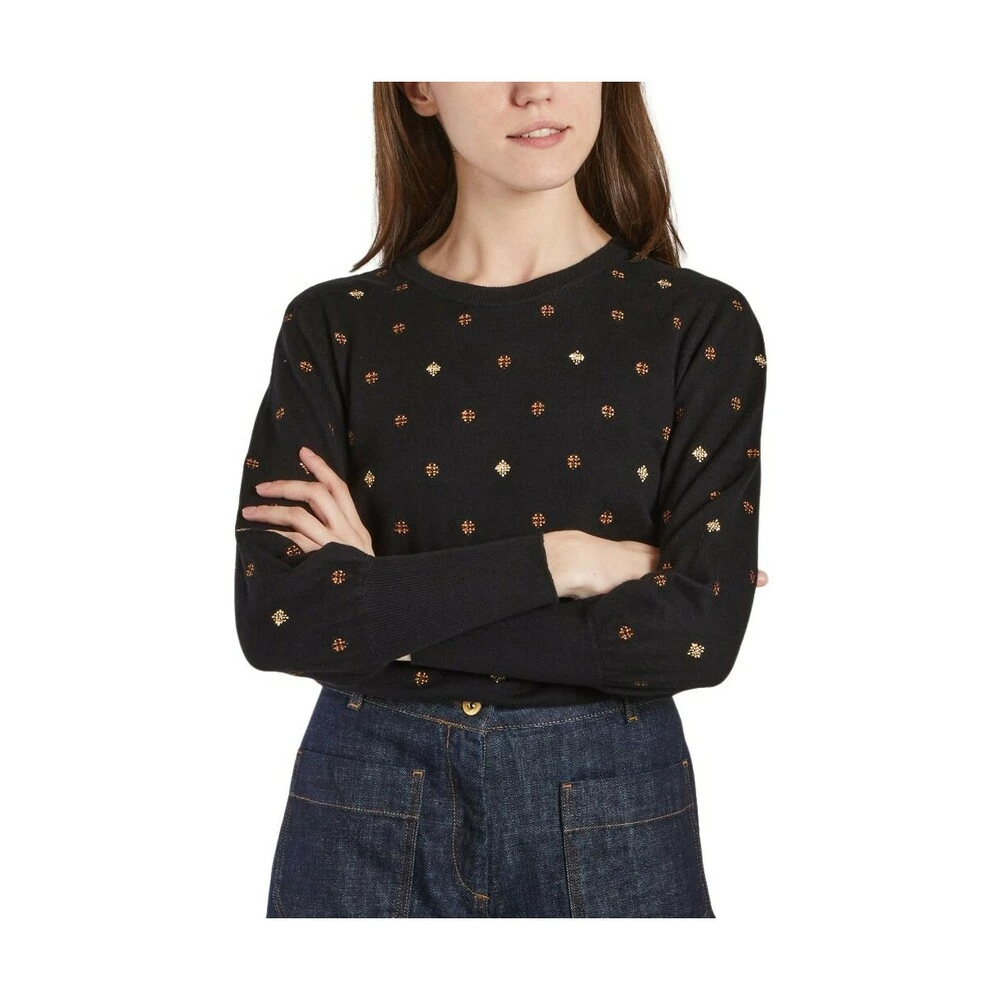 Svart genser, laget i bomull og kashmir, i fin jersey-sĂžm, eksklusiv brodert alt-over mĂžnster. Utstyrt med en rund krage, lange ermer med hĂžye monterte mansjetter, nĂŠr kroppsmodellen. Velg denne klassiske toppen av den feminine garderoben for Ă„ assosiere med hĂžye midjert blussede jeans og Ecru -stĂžvler.