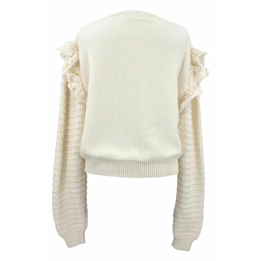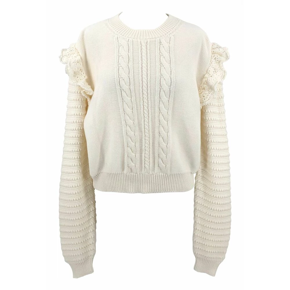 Størrelse 44 fransk. Fra 2019 -samlingen. Kremfarget mannskaphalshopp med kabelstrikk foran. Heklefrills og detaljer på lange ermer gir denne tykke hopperen et koselig intellektuelt utseende. MADE I Italia. Lengde skulder til hem: 55cm.Fabrik: 100% bomull. Ny med tagger (10/10). Song alle sesongene Stella McCartney Stella McCartney Jumper i krem bomull med heklet frills farge: hvit | Kremmateriale: Bomullstilstand: Nytt med tagstørrelse: FR44 Sign of Wear: No SKU: 143690 / UT223409 / UT223409