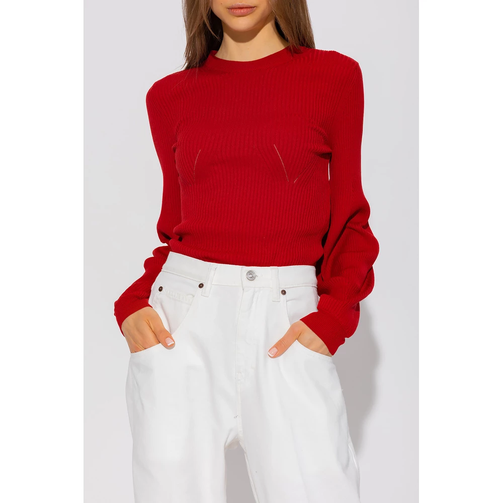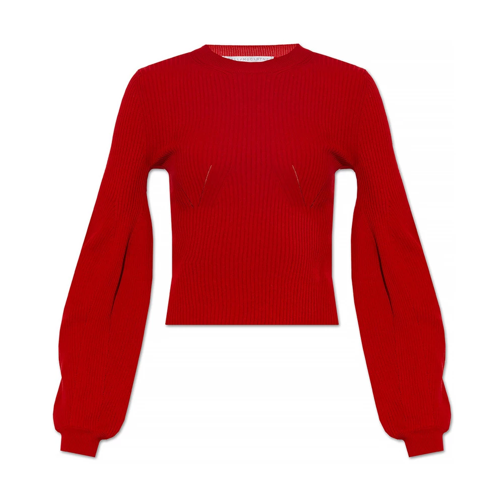 Rød ribbet crewneck -genser fra Stella McCartney. Denne designen har lange puffhylser og ribbestrikk i mannskapshalsen og mansjettene.
