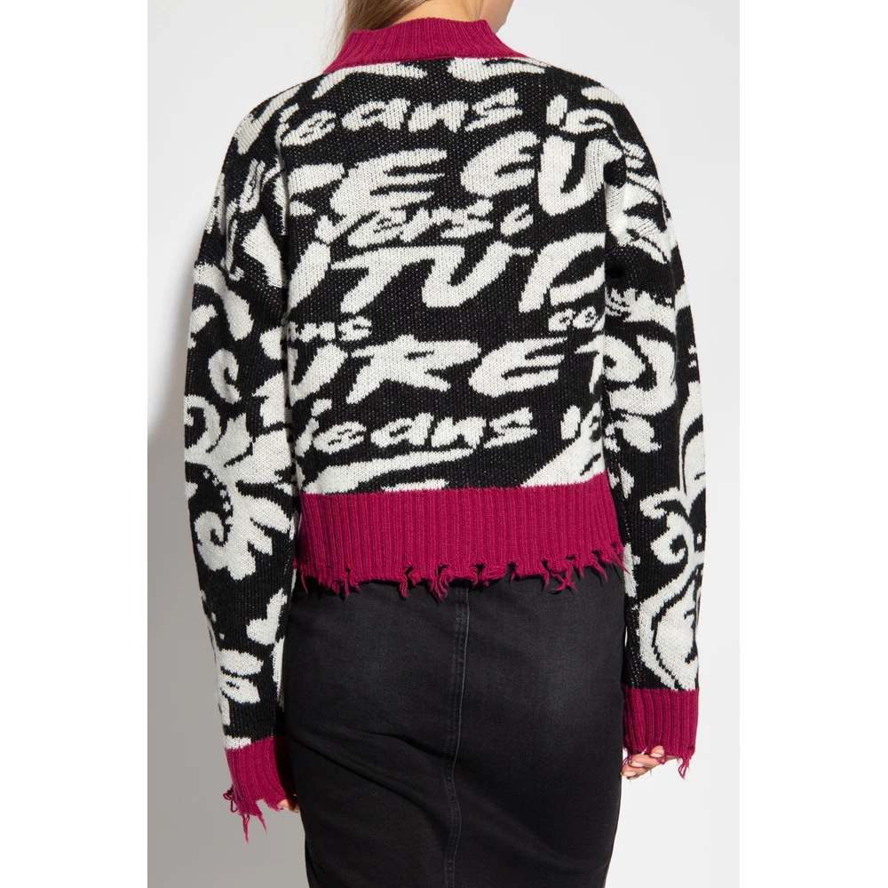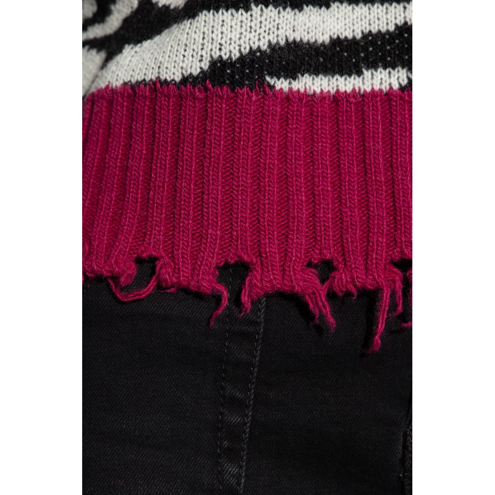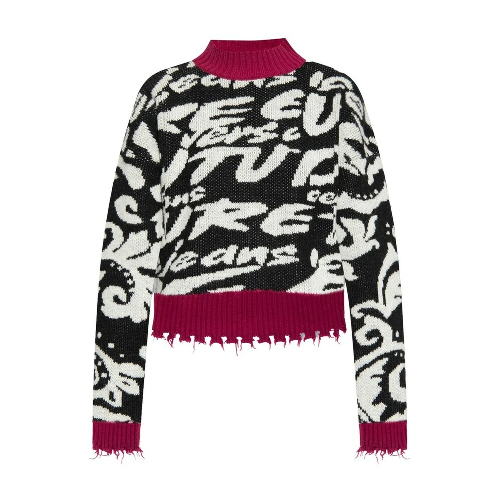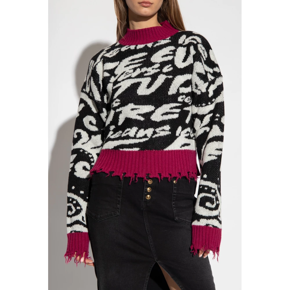 Svart, hvit og rosa genser fra Versace Jeans Couture. Denne lange ermet designet er dekorert med et mønster, og har en rund hals, ribbet kanter og rå trimmet hem.
