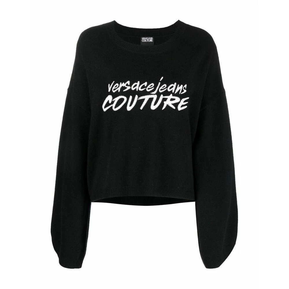 Svart crewneck -genser fra Versace Jeans Couture. Denne stilen er laget av ull, og har en brodert hvit logo, lange ermer og ribbestrikkede trimmer på kragen, bunnhemmen og mansjettene.